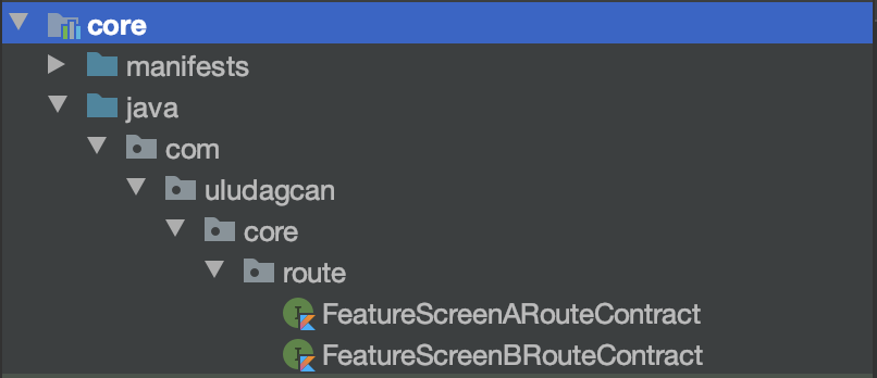 Next thing is to create Route contracts for each screen to navigate. Inside core module, we create Route interfaces for each screen.