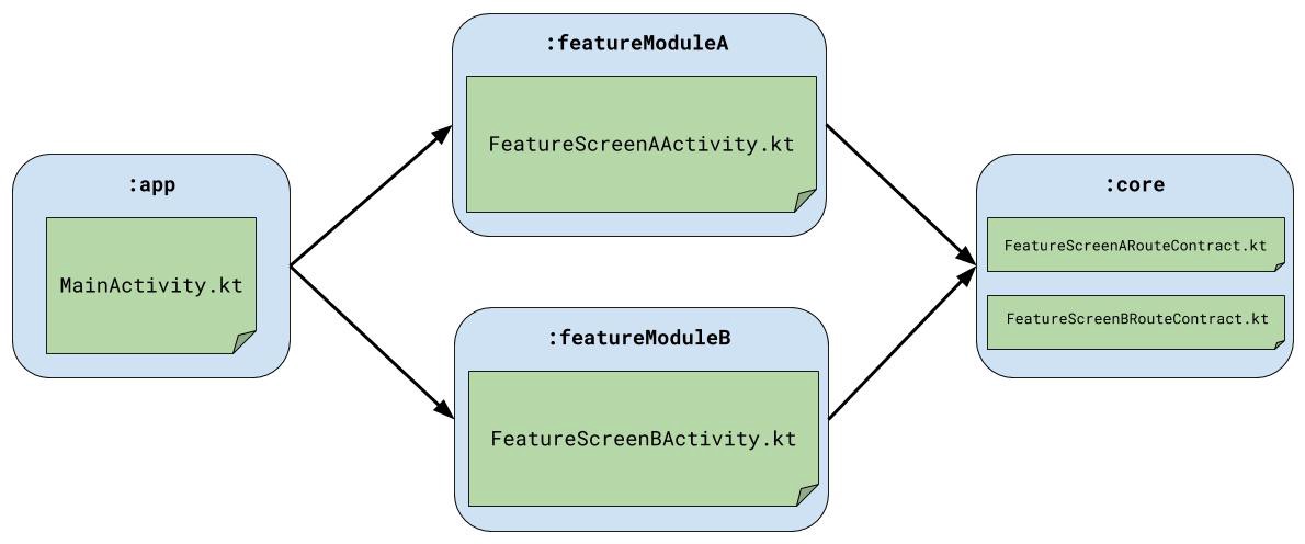 You might ask, what’s the issue in here? Well, app module depends on featureModuleA and featureModuleB. Thus, it can easily start FeatureScreenAActivity and FeatureScreenBActivity. But what if we need to start FeatureScreenBActivity from FeatureScreenAActivity and vice versa. They don’t know about each other. And if we give dependency to each other, then we create a circular dependency graph which won’t work.