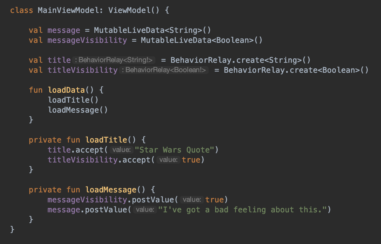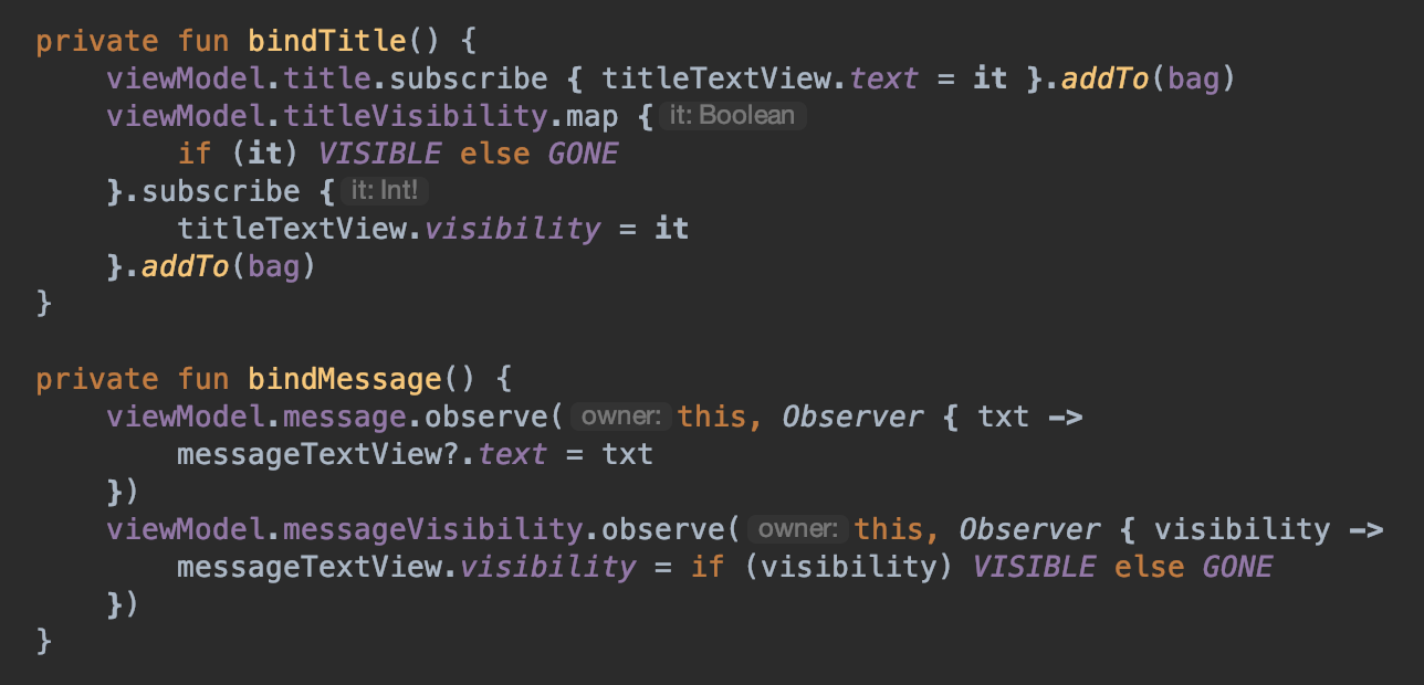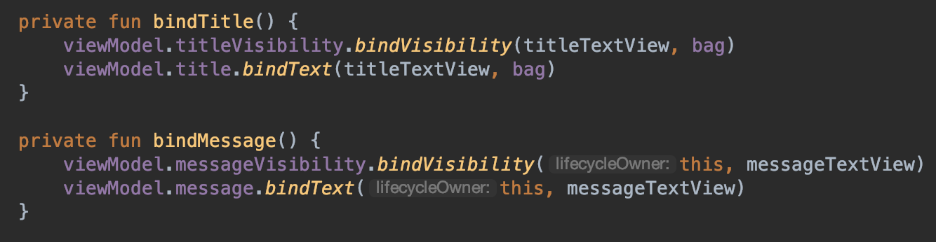 Often times I find myself observing simple values from LiveData or Rx observables and setting them to view items like TextViews or EditTexts. Or setting visibility of a Button or TextView.